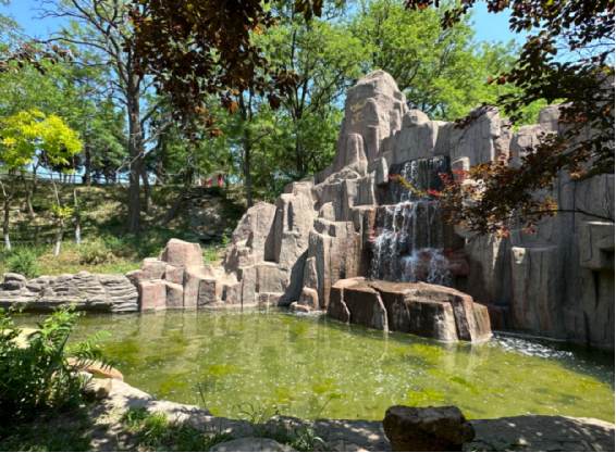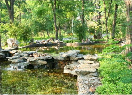 医院地处紫荆山麓,四面环山、林木资源丰富。因地理位置特殊,每逢雨季山水顺流而下,排水量较大,而医院新址人工绿化面积近1.5万平方米,绿化用水量较大。医院实施引山水入院工程,充分利用自然资源,打造院落美景,节约医院绿化用水。在医院外墙水道内侧,建一座容量为50吨储水池,汇集山水,经过过滤、沉淀、净化,通过100多米管道,注入院内假山,增添假山水系瀑布景观,同时将山水抽取至门诊水池之中,对院内花草树木进行喷淋灌溉,实现资源循环再利用,形成锦鳞竞泳、医患共赏的画面,人与自然融为一体。