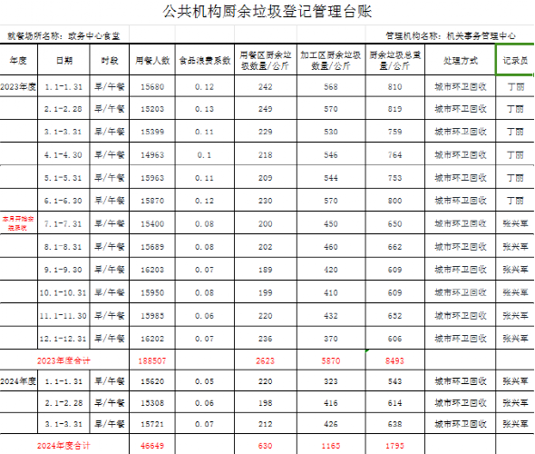2.建立厨余垃圾数量登记台账,记录标注重量、处理方式,并留存照片。对厨余垃圾进行分类处理。并根据厨余垃圾的剩量情况,制定次日的采购数量,节约成本。